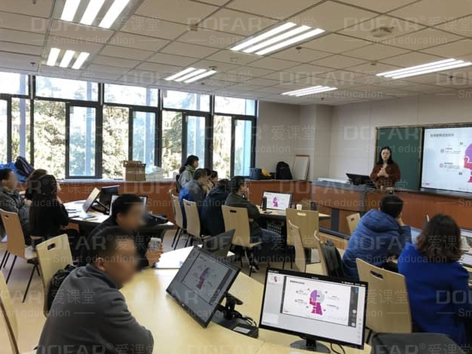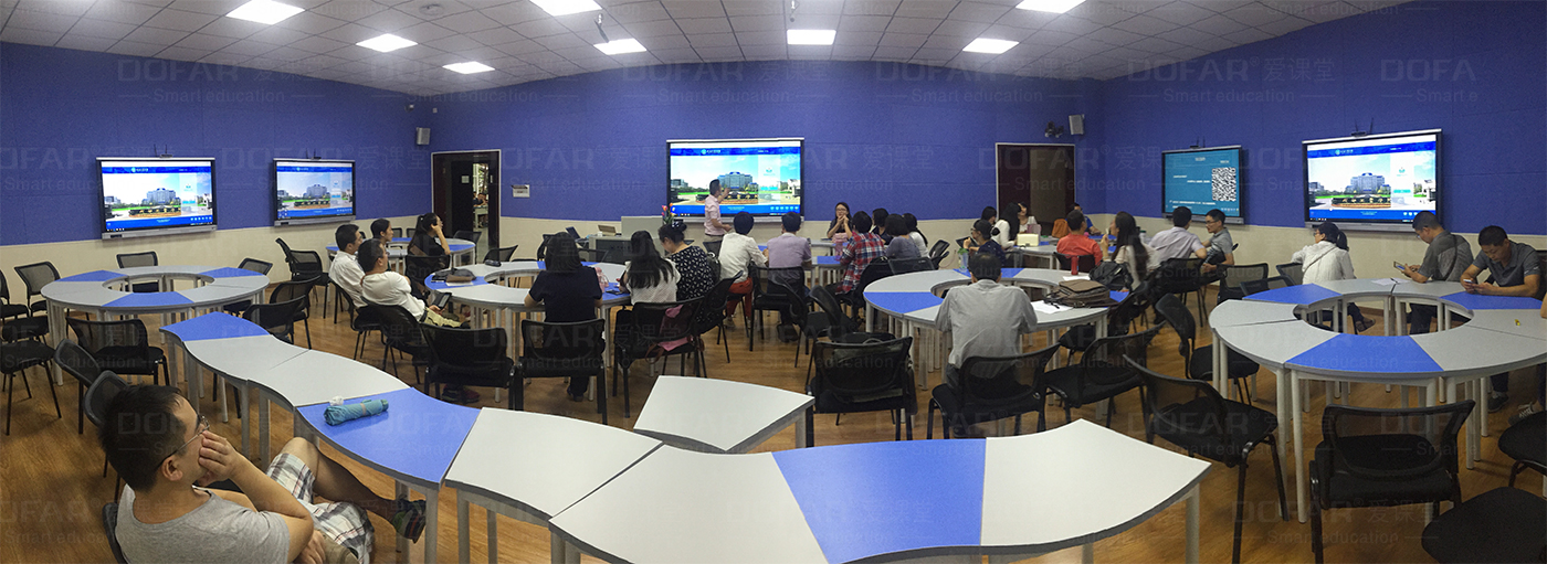 多屏研讨智慧教室打破了传统教室格局,教室的不同方位配置多台大屏幕交互一体机,集中授课时不仅便于不同方位的同学就近观看教学内容,而且更容易使同学们有沉浸式体验感,教师可以面对任意方向推进教学过程。
